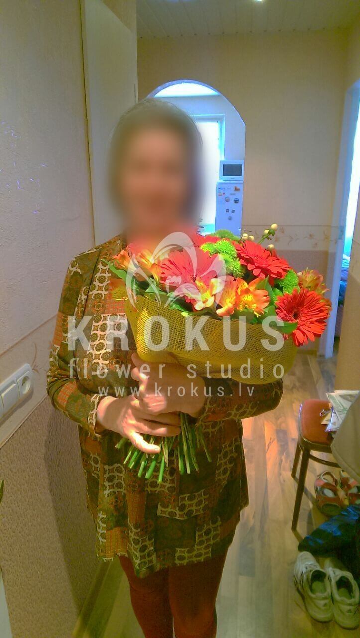 Ziedu sastāvā: Gerberas, Krizantēmas, Dzeltenas rozes, Rozā rozes, Kumelīte, Eupatorium.