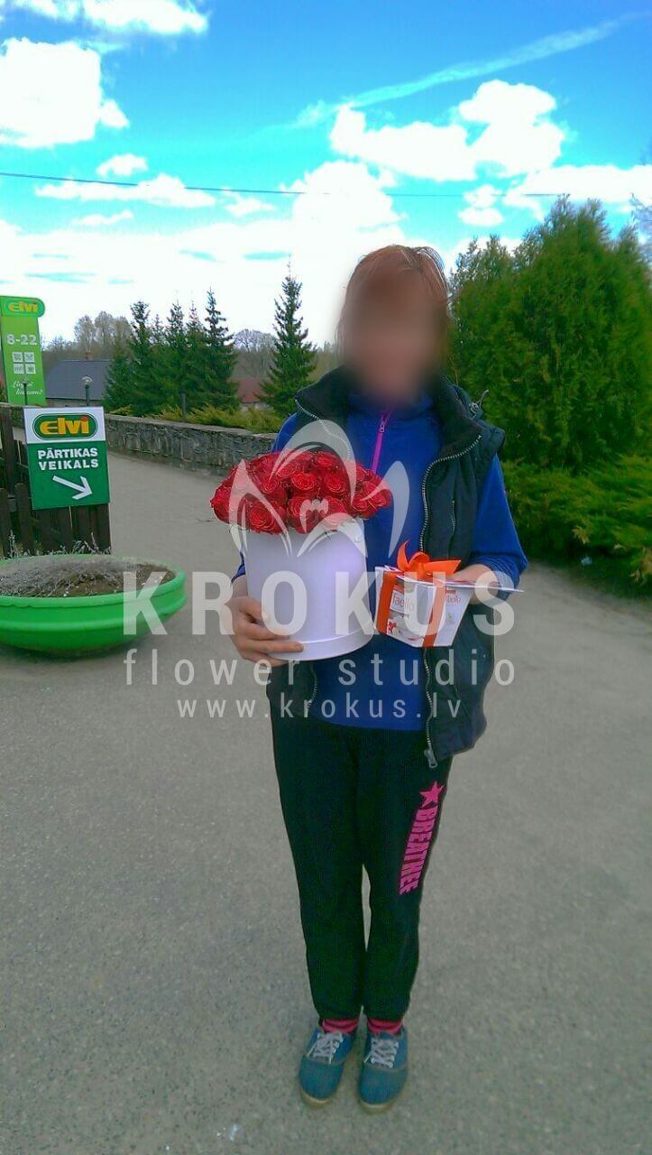 Mēs piegādājām vēl vienu pasūtījumu uz pilsētu . Pasūtītājs vēlējās: Ziedu piegāde Sarkanas rozes kastē (Fotogrāfijai ir ilustratīvs nolūks. Kastes krāsa var atšķirties.). Ziedu piegāde Raffaello 150g (Konfektes RAFFAELLO, 150g