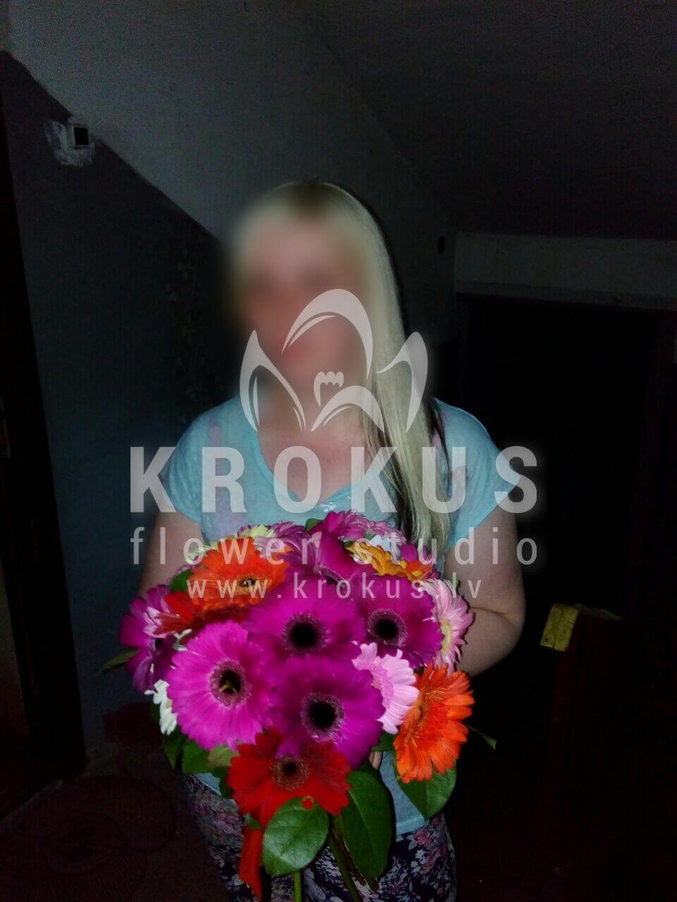 Mēs piegādājām vēl vienu pasūtījumu uz pilsētu . Pasūtītājs vēlējās: Ziedu piegāde Gerberu pušķis "Saulīte" (Kādu krāsu gerberas tik nav! Šiku ziedu pušķi mēs esam radījuši no dažādu krāsu gerberām. Sarkanām, rozā, oranžām, violetām un baltām. Šīs ir spilgtas, piesātinātas krāsas. Saulainā lente ir harmonijā ar pamata fona pušķi un saglabā savu eleganto tēlu. Jūtat pacilājošu garastāvokli? Un pasaule radīs varavīksni ap Jums!!!)