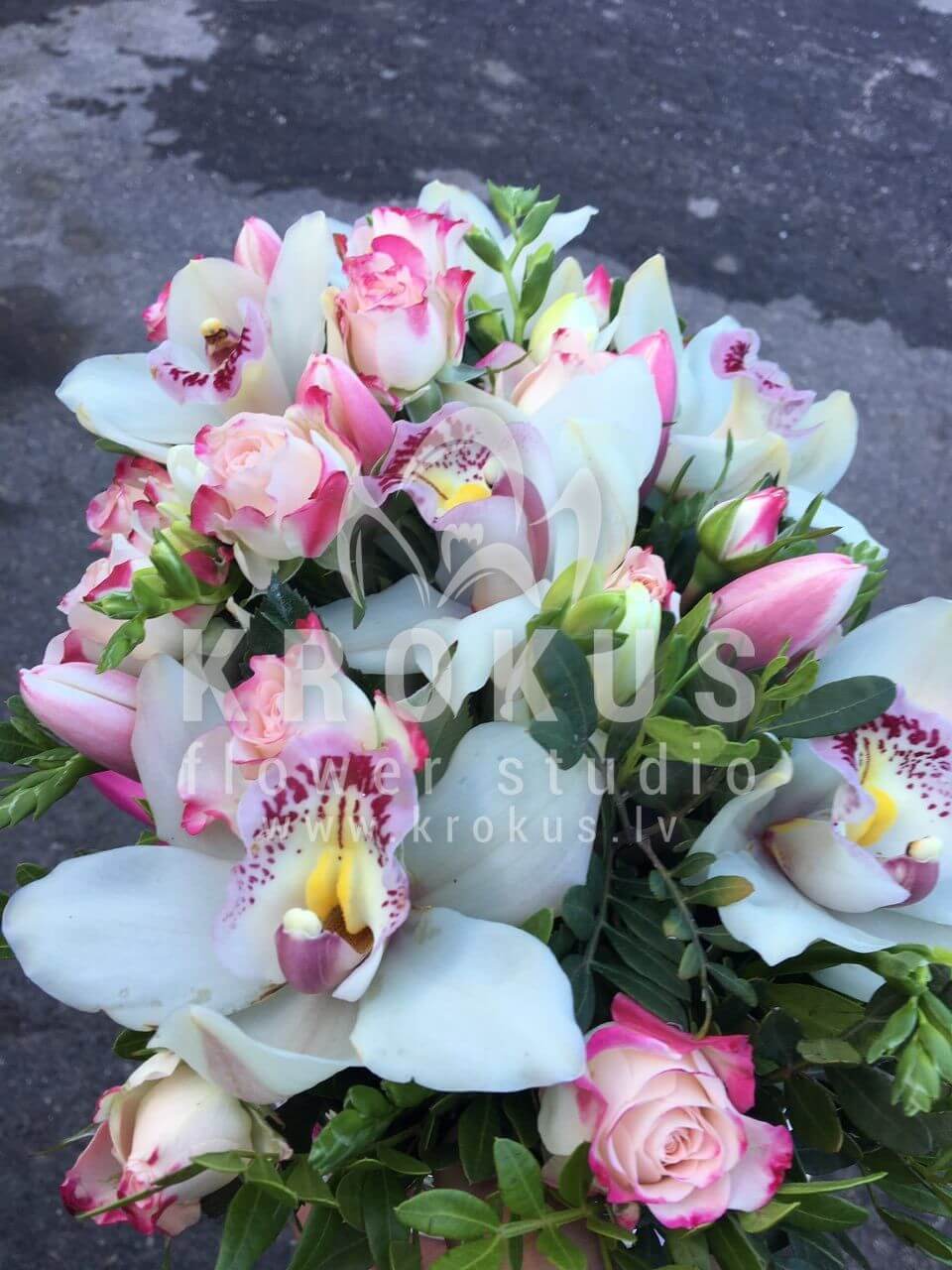 Ziedu sastāvā: Orhidejas, Frēzijas, Lizantes, Karaliskās tulpes, Tulpes, Krūmrozes, Matiola, Pistācija.