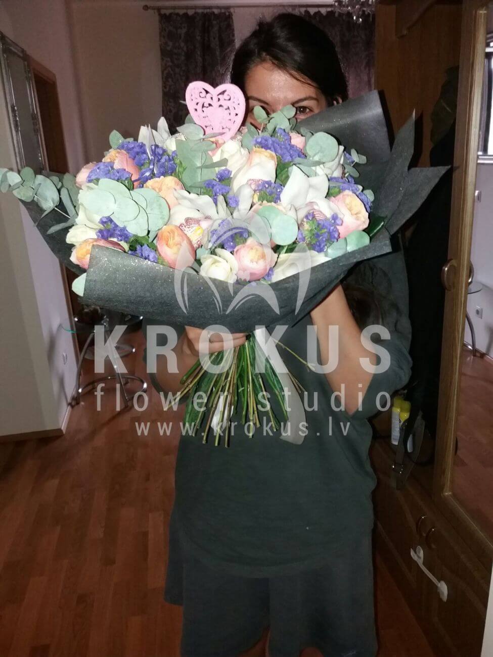 Ziedu sastāvā: Deivida Ostina rozes, Peonijas, Orhidejas, Baltas rozes, Pļavas dzelzene, Lupīna, Veronika, Brunija, Limonija, Solidago, Pitosporas, Pļavas puķes.