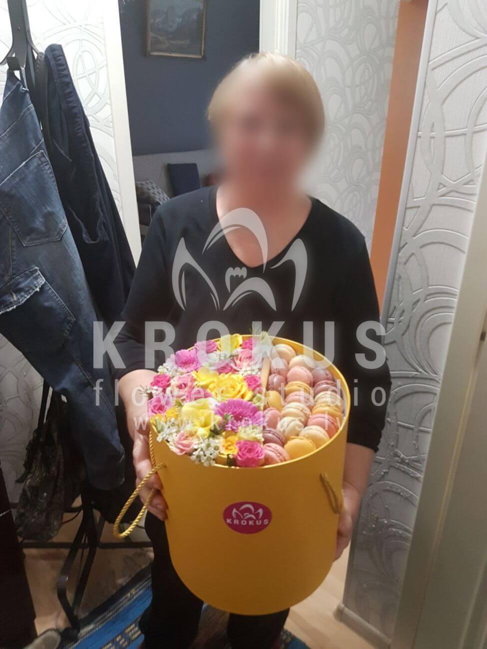 Mēs piegādājām vēl vienu pasūtījumu uz pilsētu . Pasūtītājs vēlējās: Ziedu piegāde Flowerbox ar macarooniem (Izmērs:
