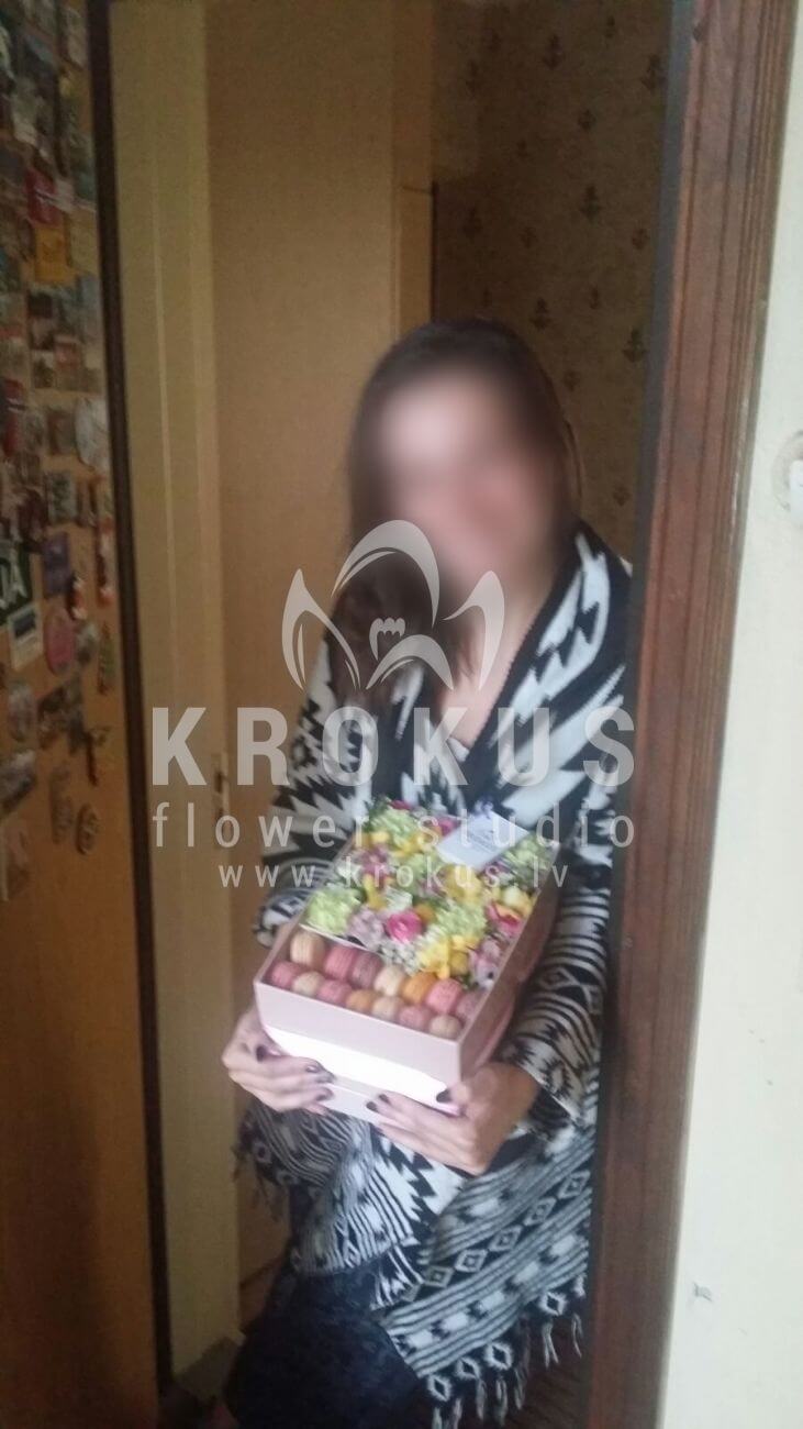 Mēs piegādājām vēl vienu pasūtījumu uz pilsētu . Pasūtītājs vēlējās: Ziedu piegāde Flowerbox ar macarooniem (Izmērs: