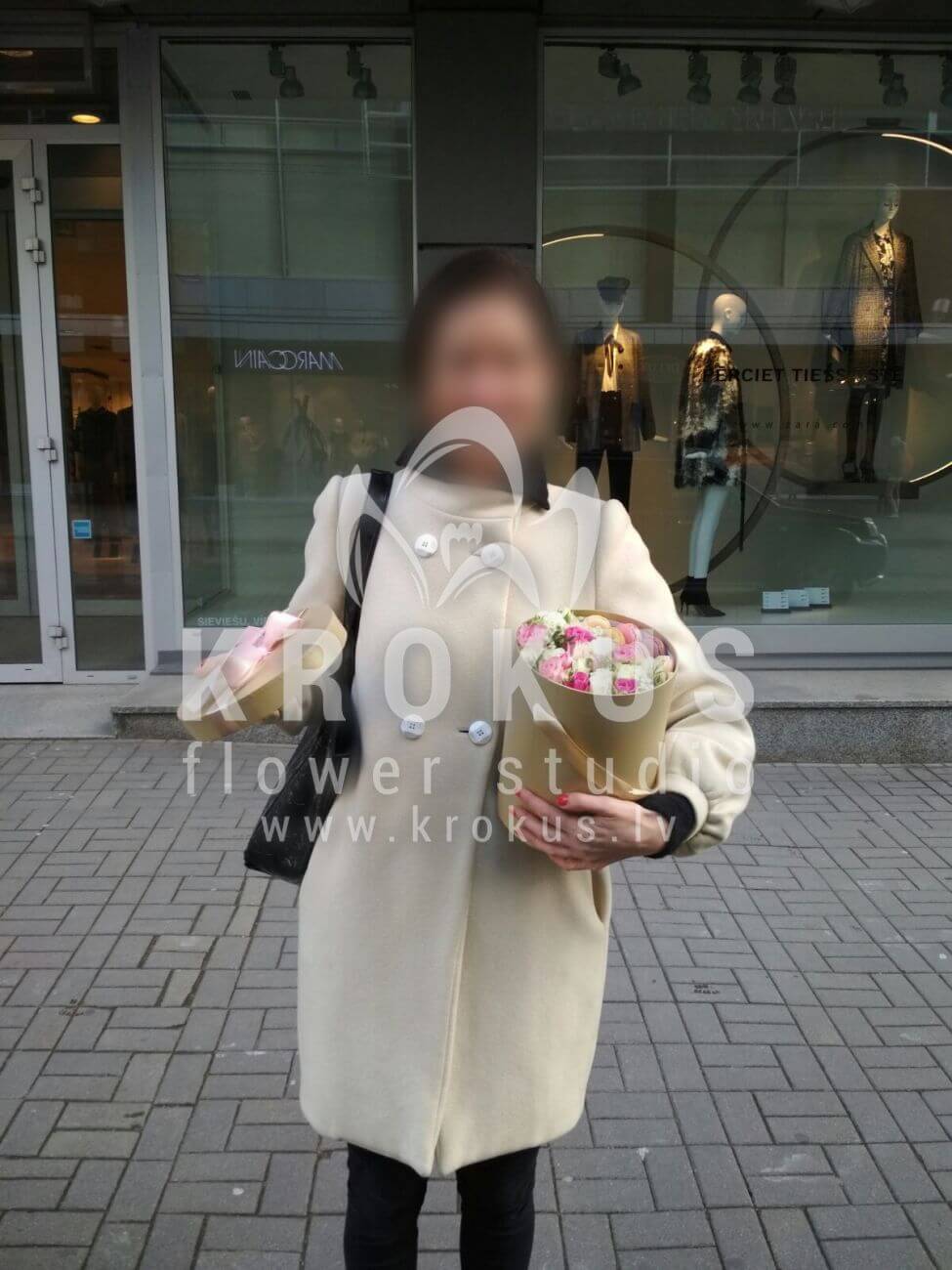 Mēs piegādājām vēl vienu pasūtījumu uz pilsētu . Pasūtītājs vēlējās: Ziedu piegāde Flowerbox ar macarooniem (Izmērs: