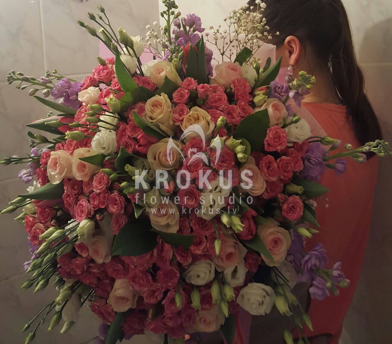 Ziedu sastāvā: Rozā rozes, Krūmrozes, Lizantes, Veronika, Tulpes, Gypsophila (Ģipsene), Ruskuss.