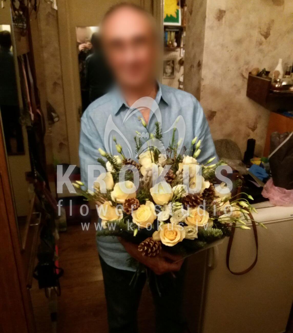 Mēs piegādājām vēl vienu pasūtījumu uz pilsētu . Pasūtītājs vēlējās: Ziedu piegāde Ziemassvētku pušķis ar rozēm (Ziemassvētku pušķis no rozēm pārsteigs ikvienu. Starp egļu zariem atver savas ziedlapiņas, delikātas krēmkrāsas rozes un baltas lizantes. Blakus tiem ir apvienoti dabas konusi un sudraba bumbiņas – waxflower. Maigs ziemas ziedu pušķis.