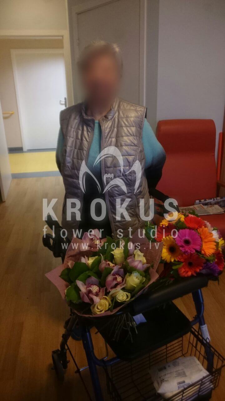 Ziedu sastāvā: Sarkanas rozes, Orhidejas, Salal (Goltjēra), Gerberas.