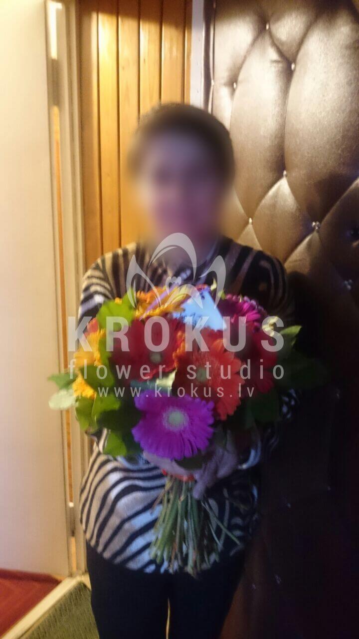 Mēs piegādājām vēl vienu pasūtījumu uz pilsētu . Pasūtītājs vēlējās: Ziedu piegāde Gerberu pušķis "Saulīte" (Kādu krāsu gerberas tik nav! Šiku ziedu pušķi mēs esam radījuši no dažādu krāsu gerberām. Sarkanām, rozā, oranžām, violetām un baltām. Šīs ir spilgtas, piesātinātas krāsas. Saulainā lente ir harmonijā ar pamata fona pušķi un saglabā savu eleganto tēlu. Jūtat pacilājošu garastāvokli? Un pasaule radīs varavīksni ap Jums!!!)