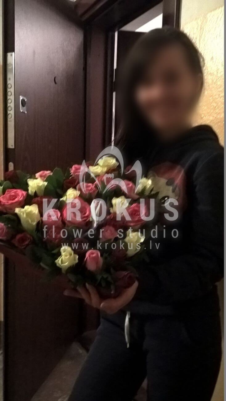 Ziedu sastāvā: Sarkanas rozes, Rozā rozes, Baltas rozes, Ruskuss, Paparde, Eikalipts.