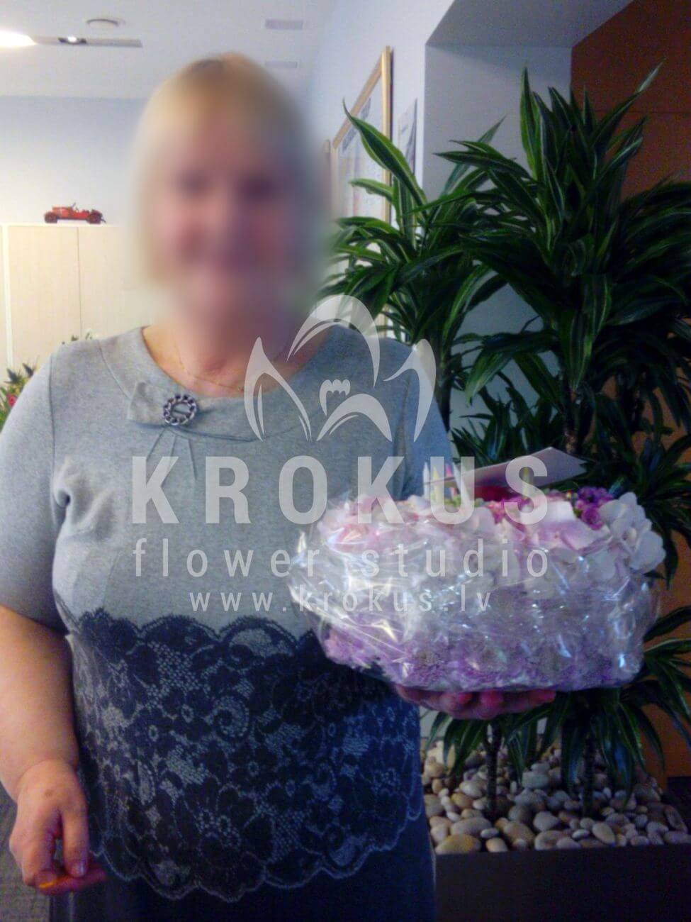 Ziedu sastāvā: Hortenzijas, Krizantēmas, Neļķes, Waxflower.