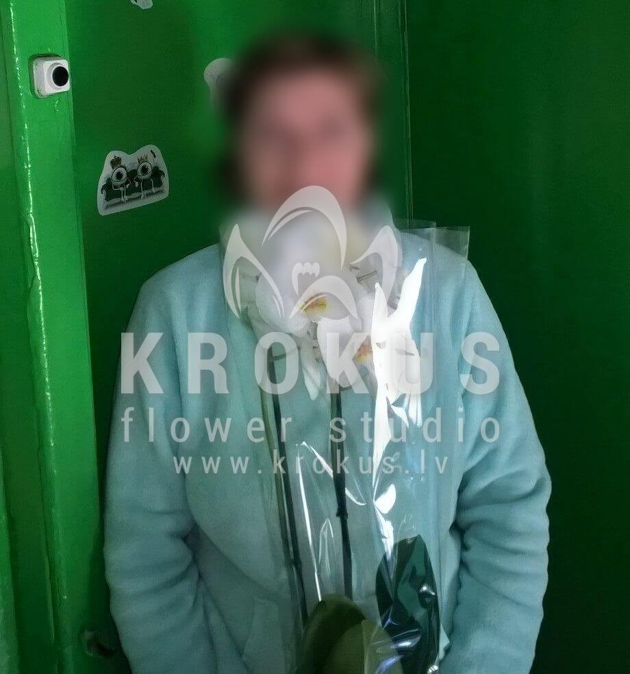 Ziedu sastāvā: Orhidejas, Matiola, Krizantēmas, Neļķes, Krūmrozes.