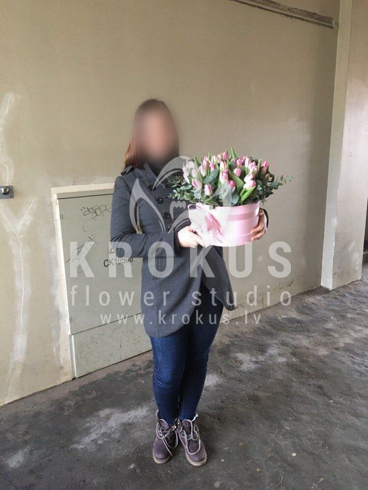 Ziedu sastāvā: Tulpes, Eikalipts, Stilīga kastīte.