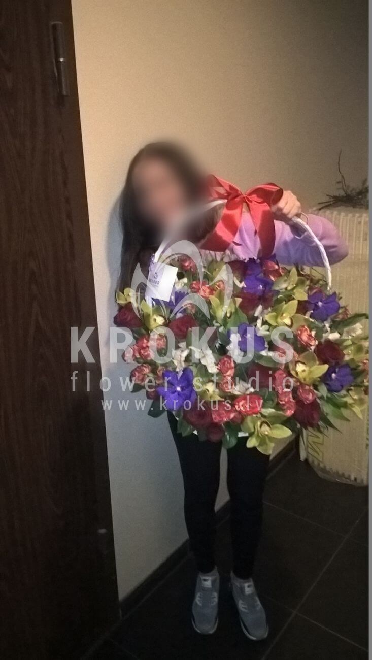 Ziedu sastāvā: Orhidejas, Alstremērija, Krūmrozes, Sarkanas rozes, Salal (Goltjēra).