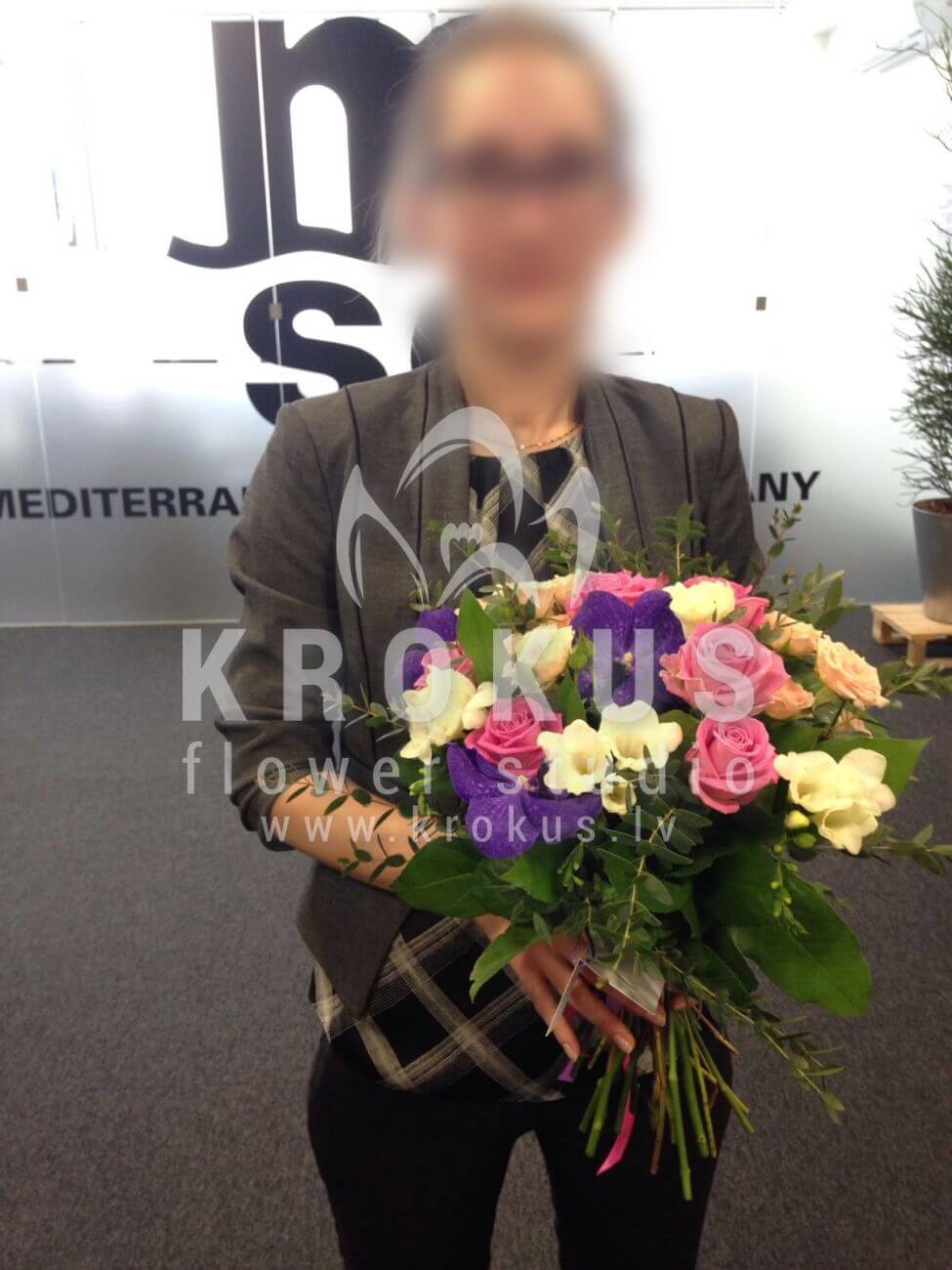Ziedu sastāvā: Orhidejas, Rozā rozes, Krūmrozes, Frēzijas, Eikalipts.