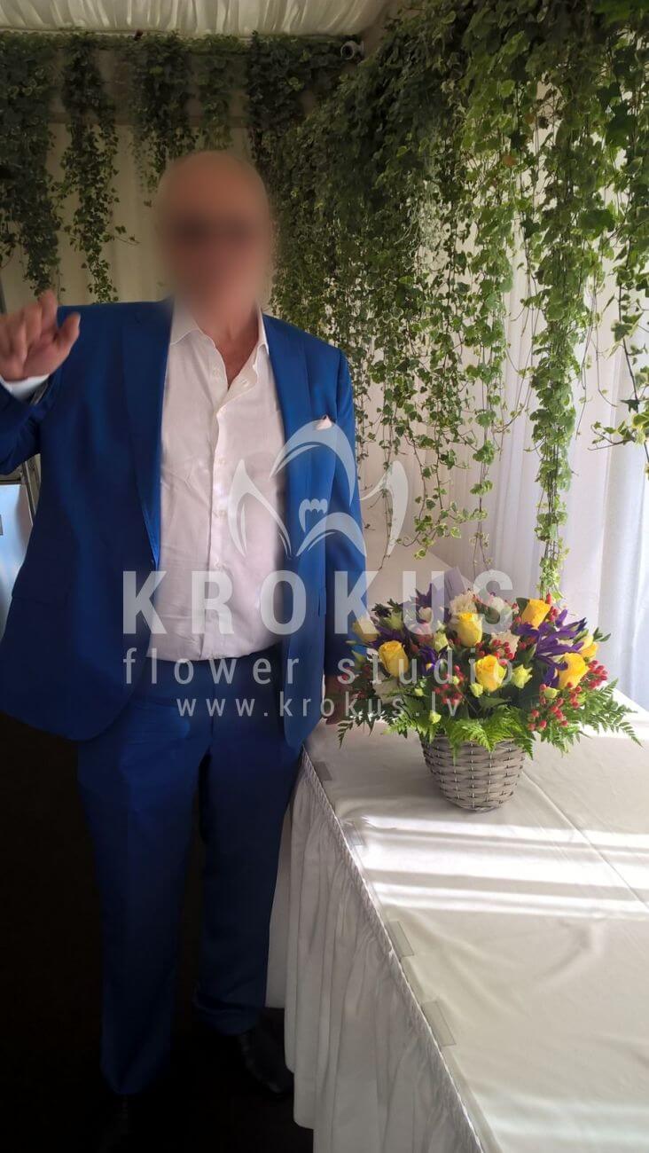 Ziedu sastāvā: Īriss, Dzeltenas rozes, Alstremērija, Hypericum, Salal (Goltjēra), Paparde.