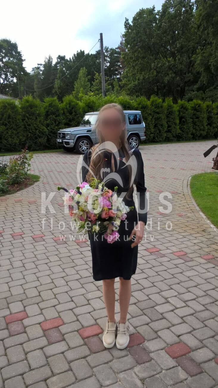 Ziedu sastāvā: Deivida Ostina rozes, Peonijas, Orhidejas, Baltas rozes, Pļavas dzelzene, Lupīna, Veronika, Brunija, Limonija, Solidago, Pitosporas, Pļavas puķes.