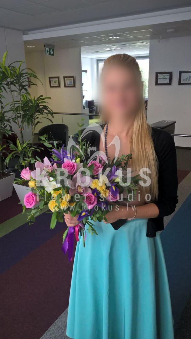 Ziedu sastāvā: Orhidejas, Rozā rozes, Krūmrozes, Frēzijas, Eikalipts.