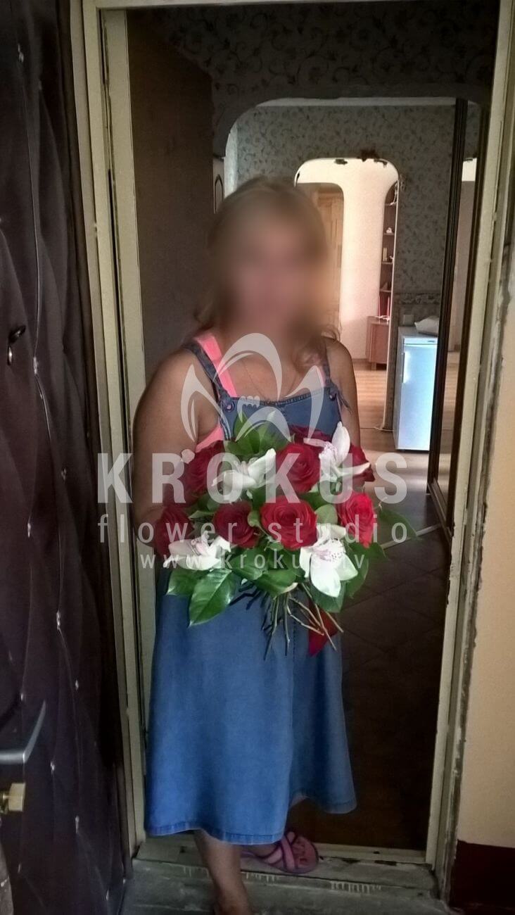 Ziedu sastāvā: Sarkanas rozes, Orhidejas, Salal (Goltjēra).