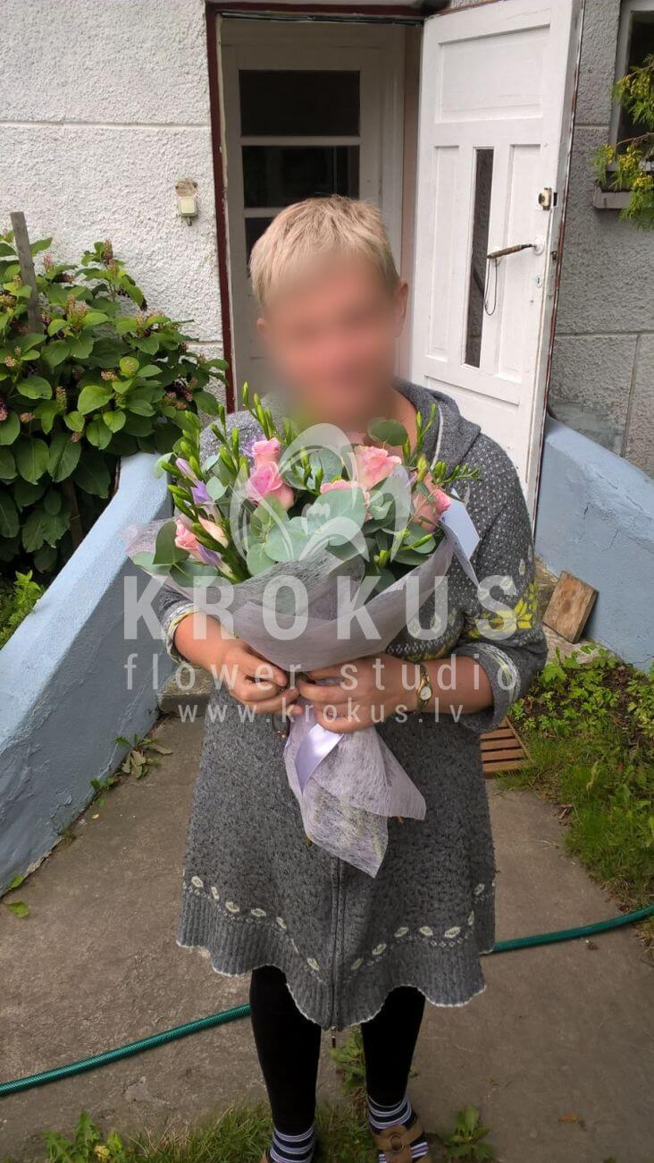 Ziedu sastāvā: Frēzijas, Rozā rozes, Eikalipts.