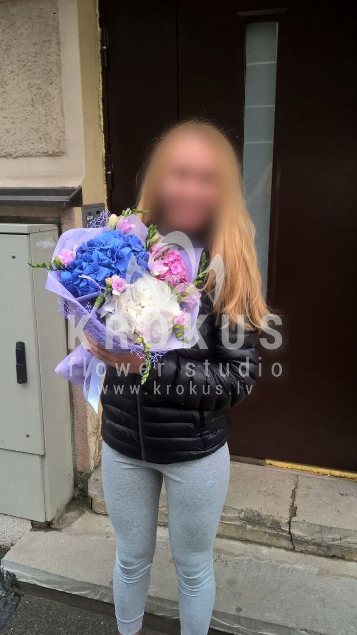Ziedu sastāvā: Neļķes, Lizantes, Krūmrozes, Hortenzijas.