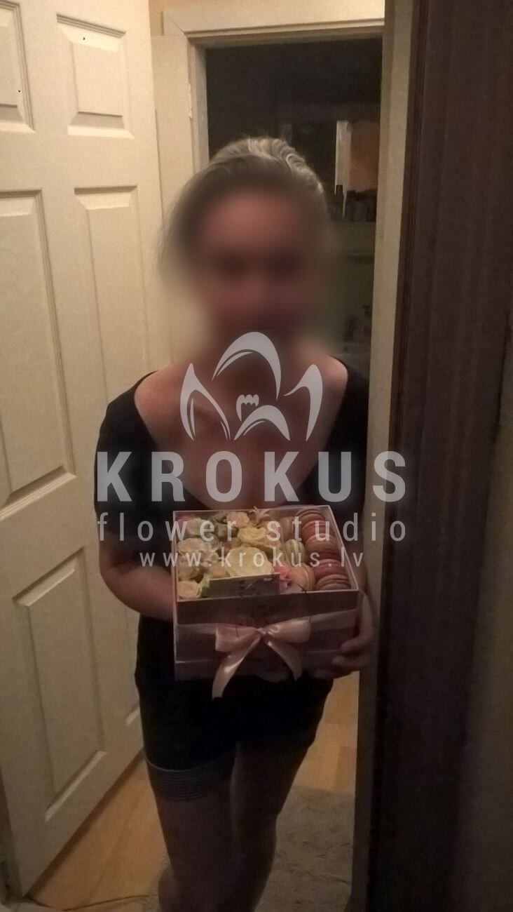 Mēs piegādājām vēl vienu pasūtījumu uz pilsētu . Pasūtītājs vēlējās: Ziedu piegāde Flowerbox ar macarooniem (Izmērs: