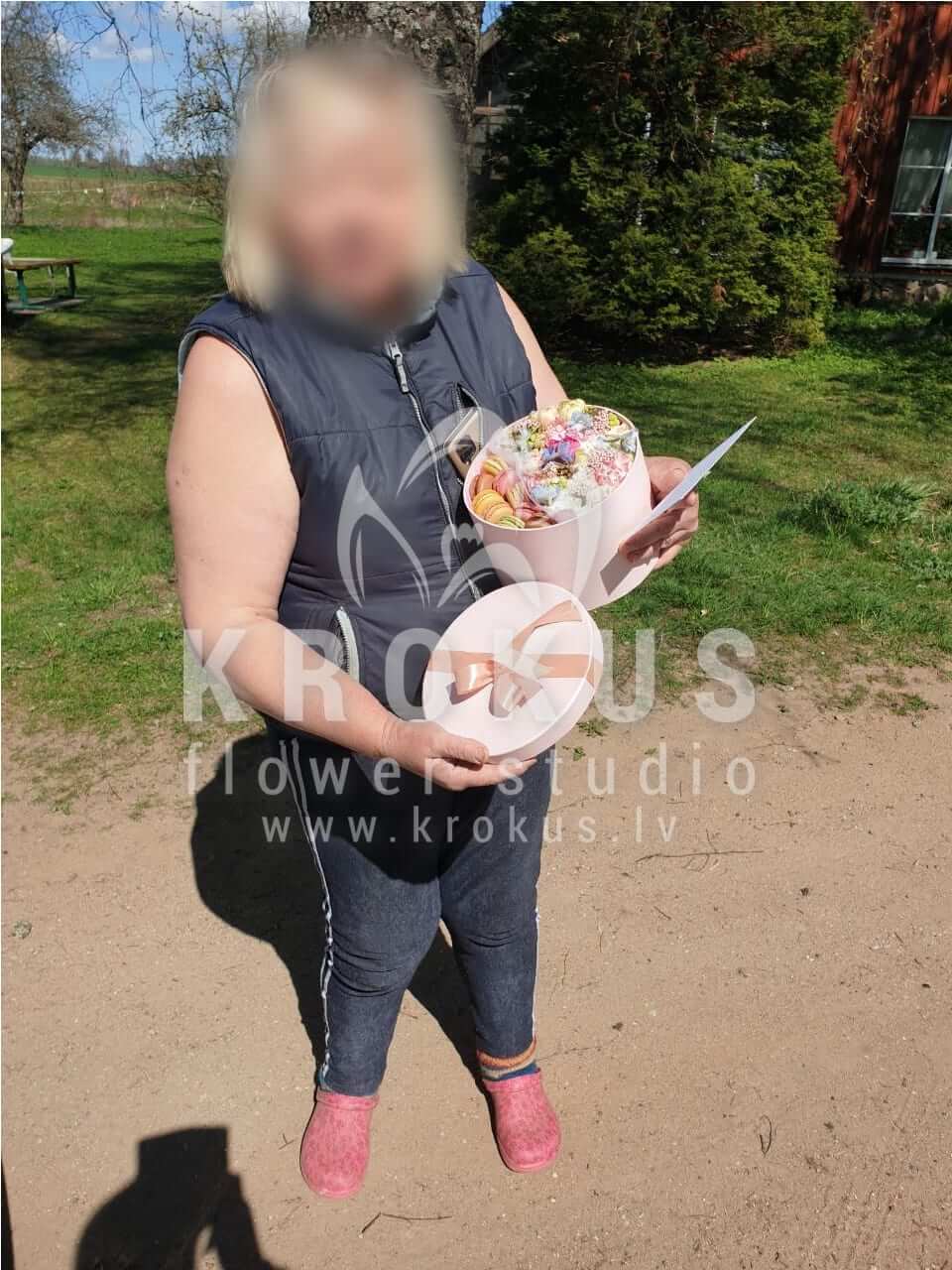 Mēs piegādājām vēl vienu pasūtījumu uz pilsētu . Pasūtītājs vēlējās: Ziedu piegāde Flowerbox ar macarooniem (Izmērs: