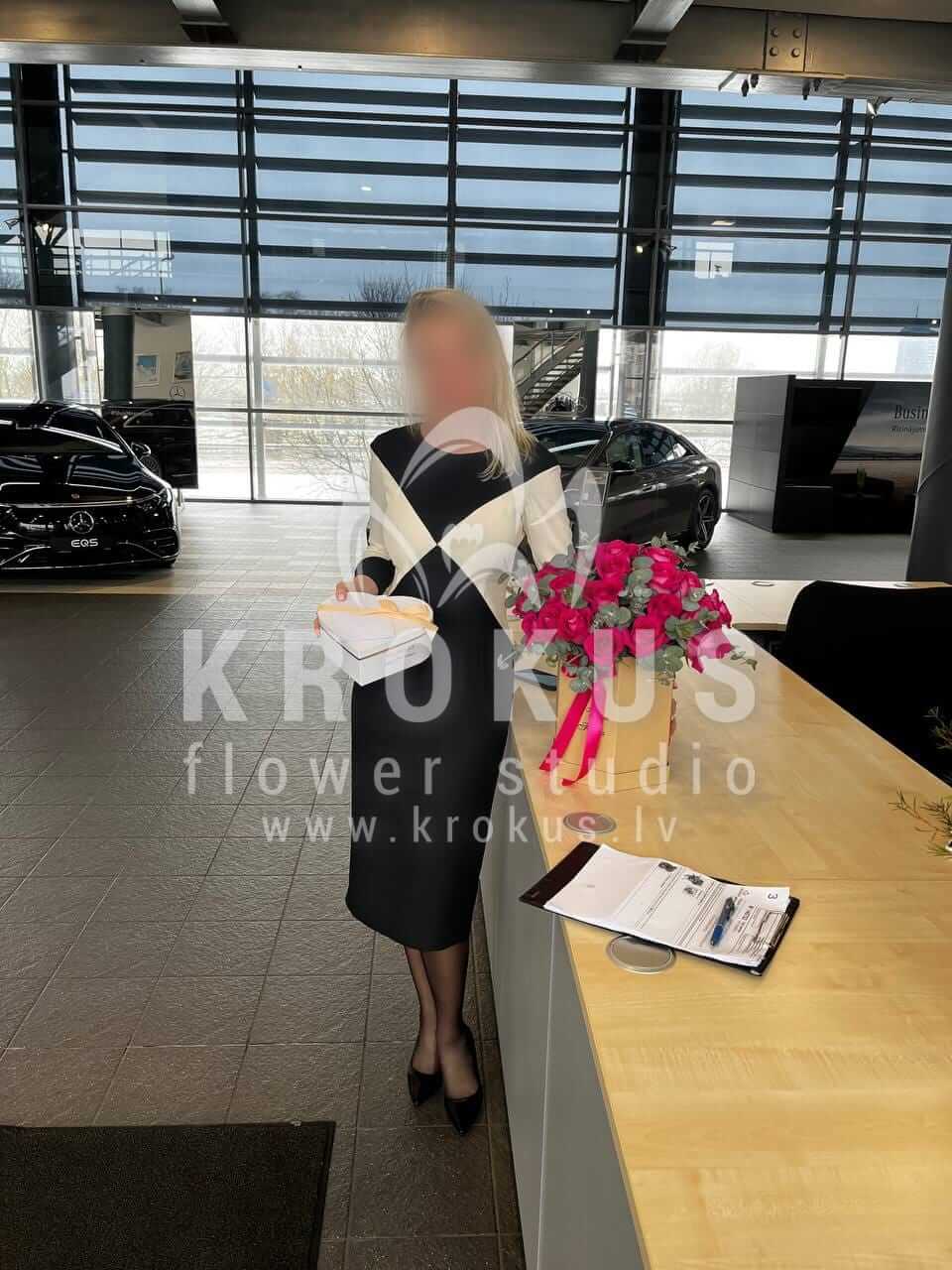 Ziedu sastāvā: Rozā rozes, Eikalipts, Stilīga kastīte.