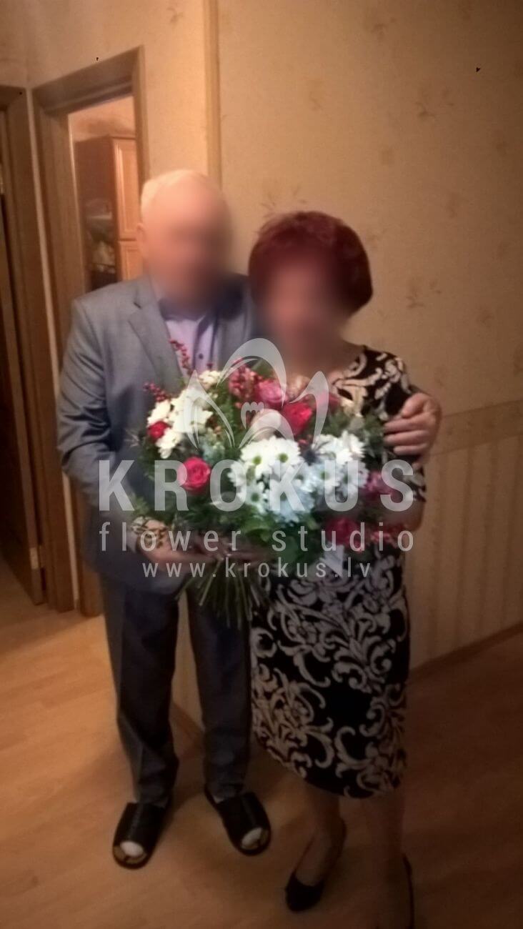 Ziedu sastāvā: Krizantēmas, Divkrāsu rozes, Hortenzijas, Veronika, Solidago, Limonija, Eryngium, Pitosporas, Neļķes.