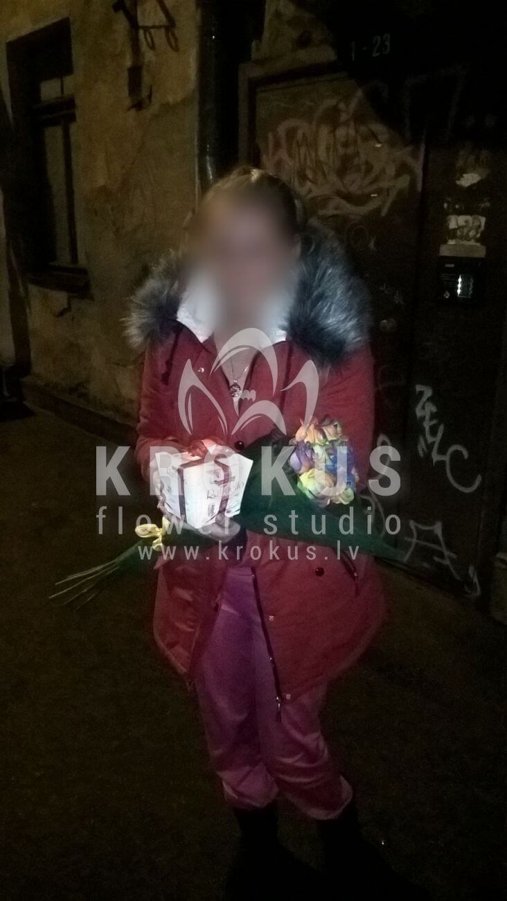 Mēs piegādājām vēl vienu pasūtījumu uz pilsētu . Pasūtītājs vēlējās: Ziedu piegāde Varavīksnes rozes. Ziedu piegāde Raffaello 150g (Konfektes RAFFAELLO, 150g