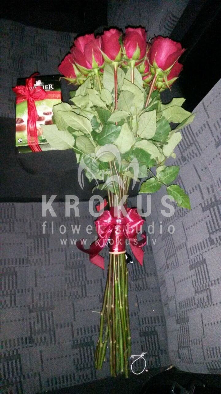Ziedu sastāvā: Sarkanas rozes, Peonveidīgās rozes, Krūmrozes, Orhidejas, Alstremērija, Eryngium, Ornithogalum (Baltstarīte), Eikalipts, Lotoss.