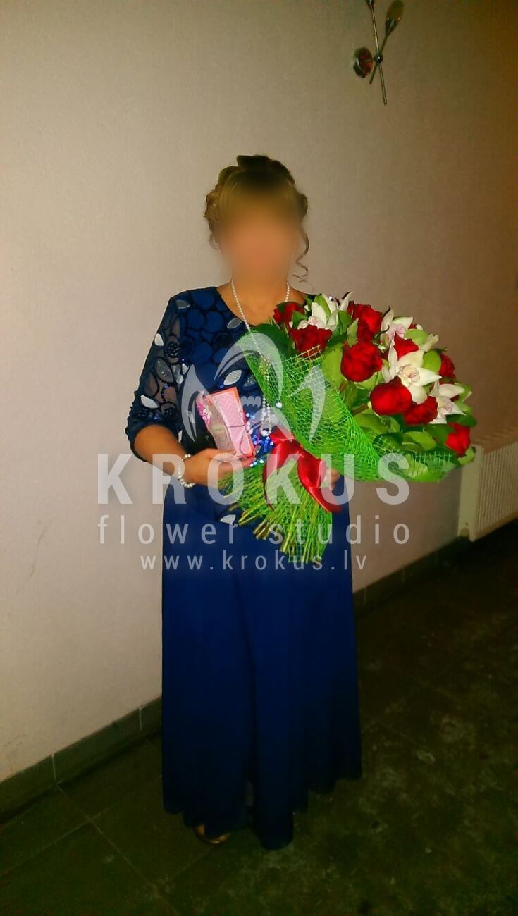 Ziedu sastāvā: Sarkanas rozes, Orhidejas, Salal (Goltjēra).