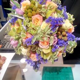 Ziedu sastāvā: Deivida Ostina rozes, Peonijas, Orhidejas, Baltas rozes, Pļavas dzelzene, Lupīna, Veronika, Brunija, Limonija, Solidago, Pitosporas, Pļavas puķes.
