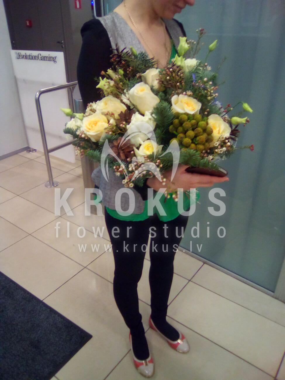 Mēs piegādājām vēl vienu pasūtījumu uz pilsētu . Pasūtītājs vēlējās: Ziedu piegāde Ziemassvētku pušķis ar rozēm (Ziemassvētku pušķis no rozēm pārsteigs ikvienu. Starp egļu zariem atver savas ziedlapiņas, delikātas krēmkrāsas rozes un baltas lizantes. Blakus tiem ir apvienoti dabas konusi un sudraba bumbiņas – waxflower. Maigs ziemas ziedu pušķis.