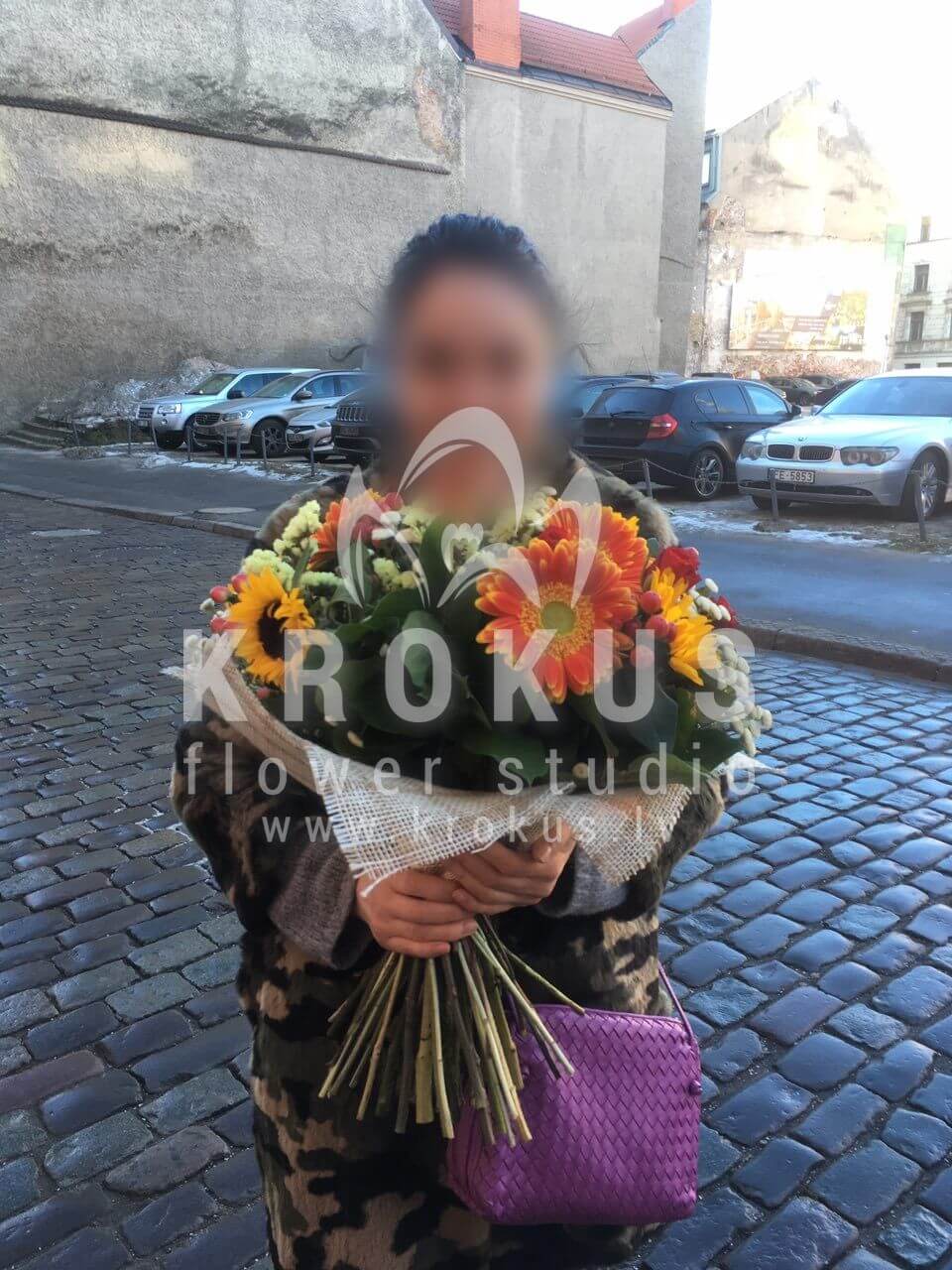 Ziedu sastāvā: Saulespuķes, Krūmrozes, Krizantēmas, Hypericum, Solidago, Gerberas, Pļavas puķes.
