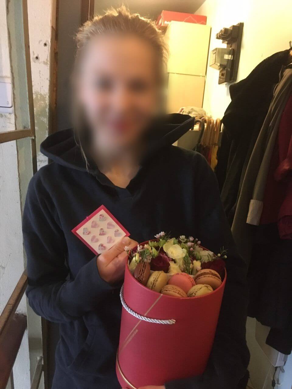 Mēs piegādājām vēl vienu pasūtījumu uz pilsētu Rīga. Pasūtītājs vēlējās: Ziedu piegāde Flowerbox ar macarooniem (Izmērs: