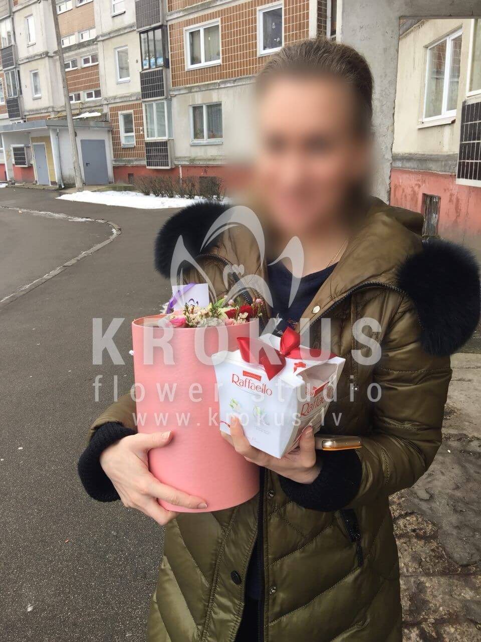Mēs piegādājām vēl vienu pasūtījumu uz pilsētu Rīga. Pasūtītājs vēlējās: Ziedu piegāde Flowerbox ar macarooniem (Izmērs:
