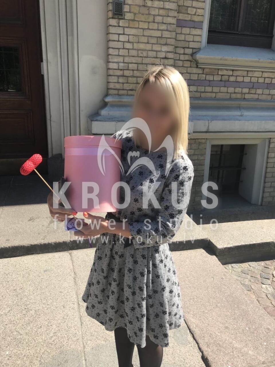 Mēs piegādājām vēl vienu pasūtījumu uz pilsētu Rīga. Pasūtītājs vēlējās: Ziedu piegāde Flowerbox ar makarūniem (macaron) (Izmērs: