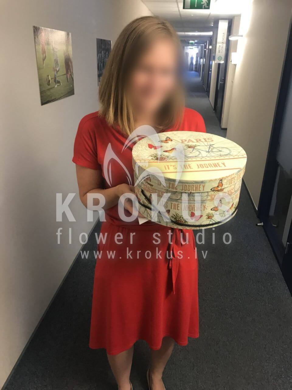 Mēs piegādājām vēl vienu pasūtījumu uz pilsētu Rīga. Pasūtītājs vēlējās: Ziedu piegāde Flowerbox ar macarooniem (Izmērs: