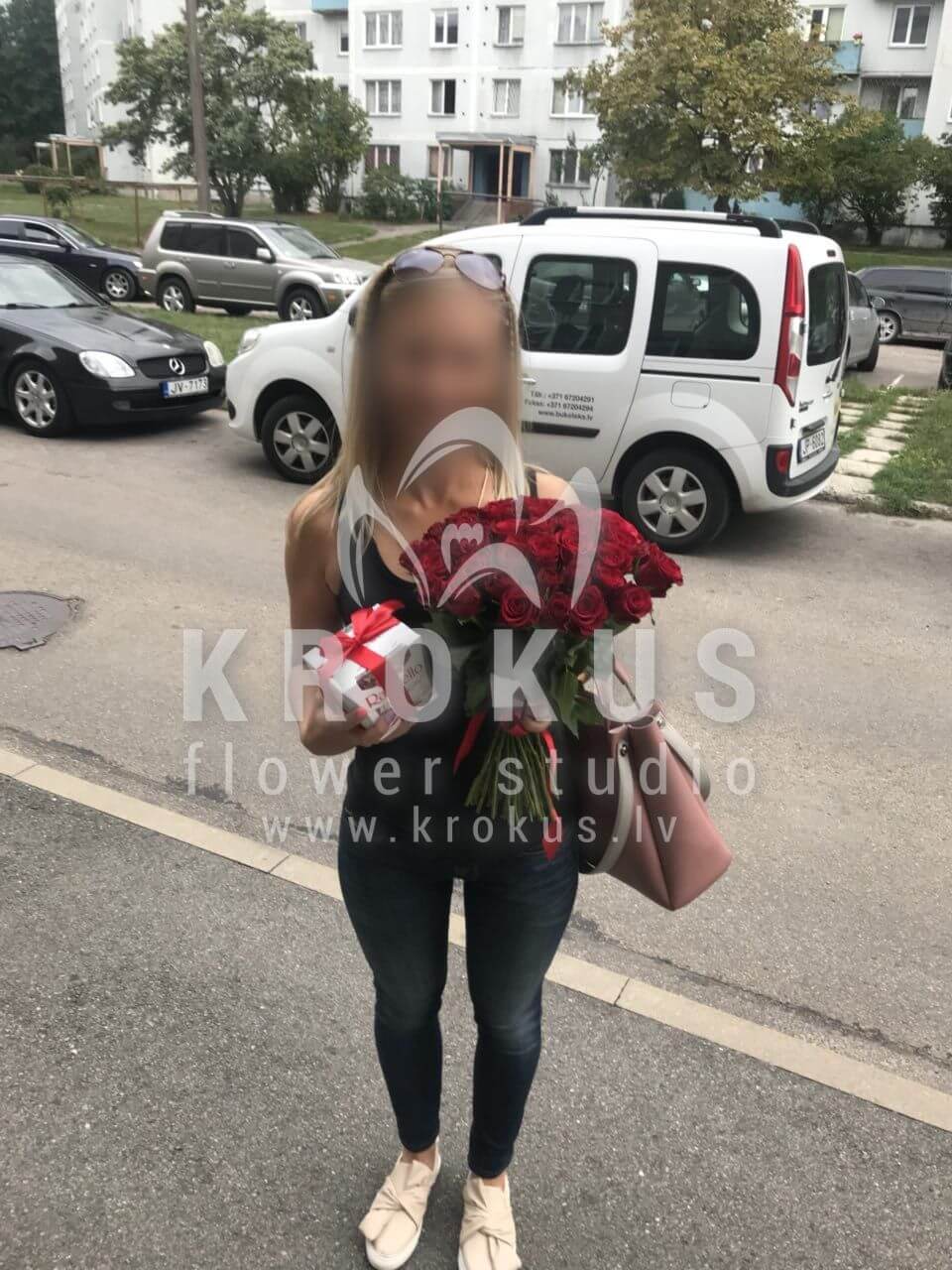 Mēs piegādājām vēl vienu pasūtījumu uz pilsētu Rīga. Pasūtītājs vēlējās: Ziedu piegāde 51 Sarkana roze SUPER CENA!!!. Ziedu piegāde Raffaello 150g (Konfektes RAFFAELLO, 150g