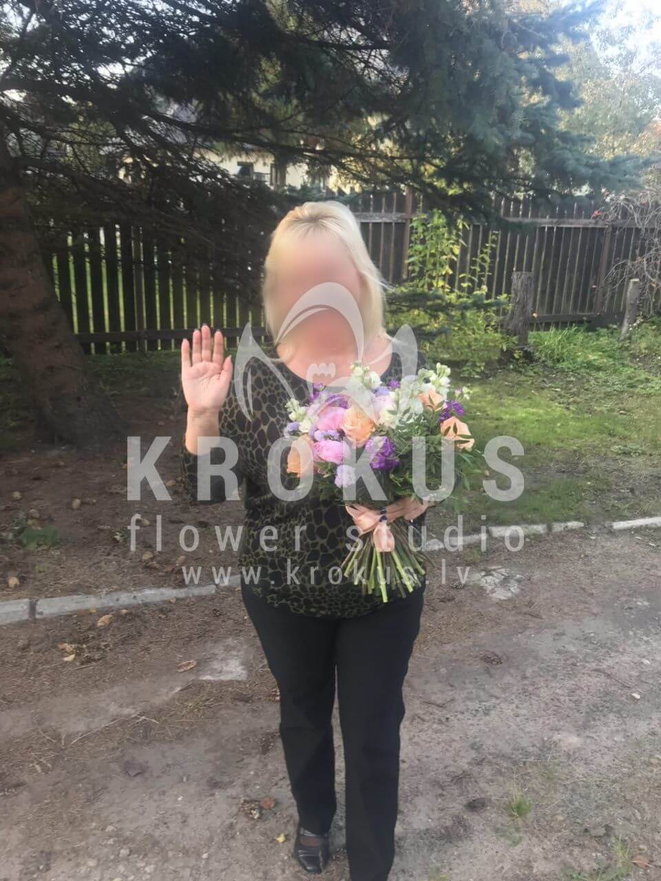 Ziedu sastāvā: Matiola, Peonijas, Krēmkrāsas rozes, Delphinium (Gaiļpiesis), Pistācija.
