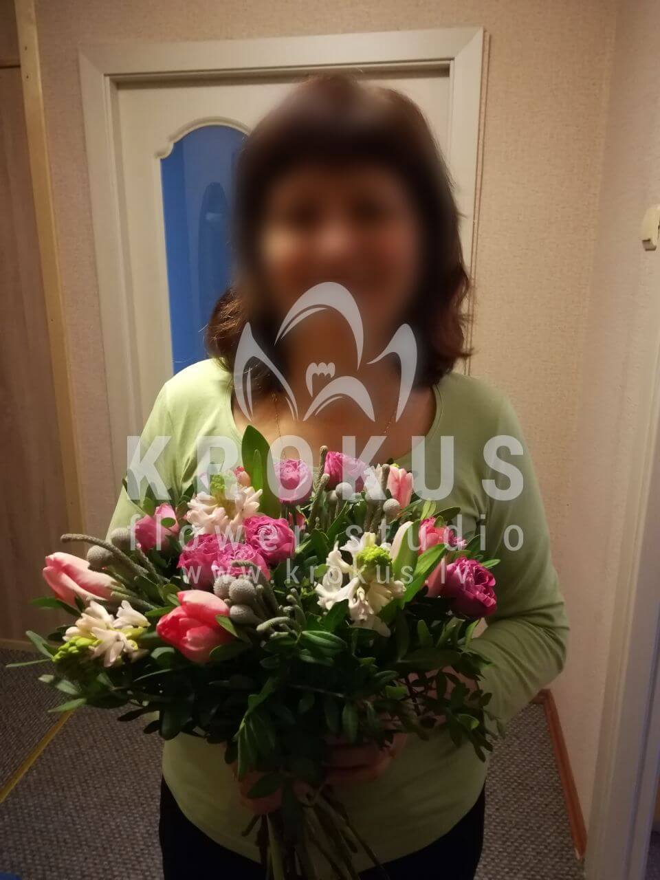 Ziedu sastāvā: Rozā rozes, Hiacinte, Tulpes, Berzēlija, Eikalipts.