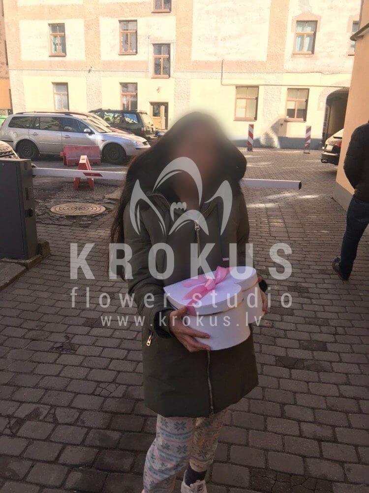 Mēs piegādājām vēl vienu pasūtījumu uz pilsētu Rīga. Pasūtītājs vēlējās: Ziedu piegāde Flowerbox ar macarooniem (Izmērs: