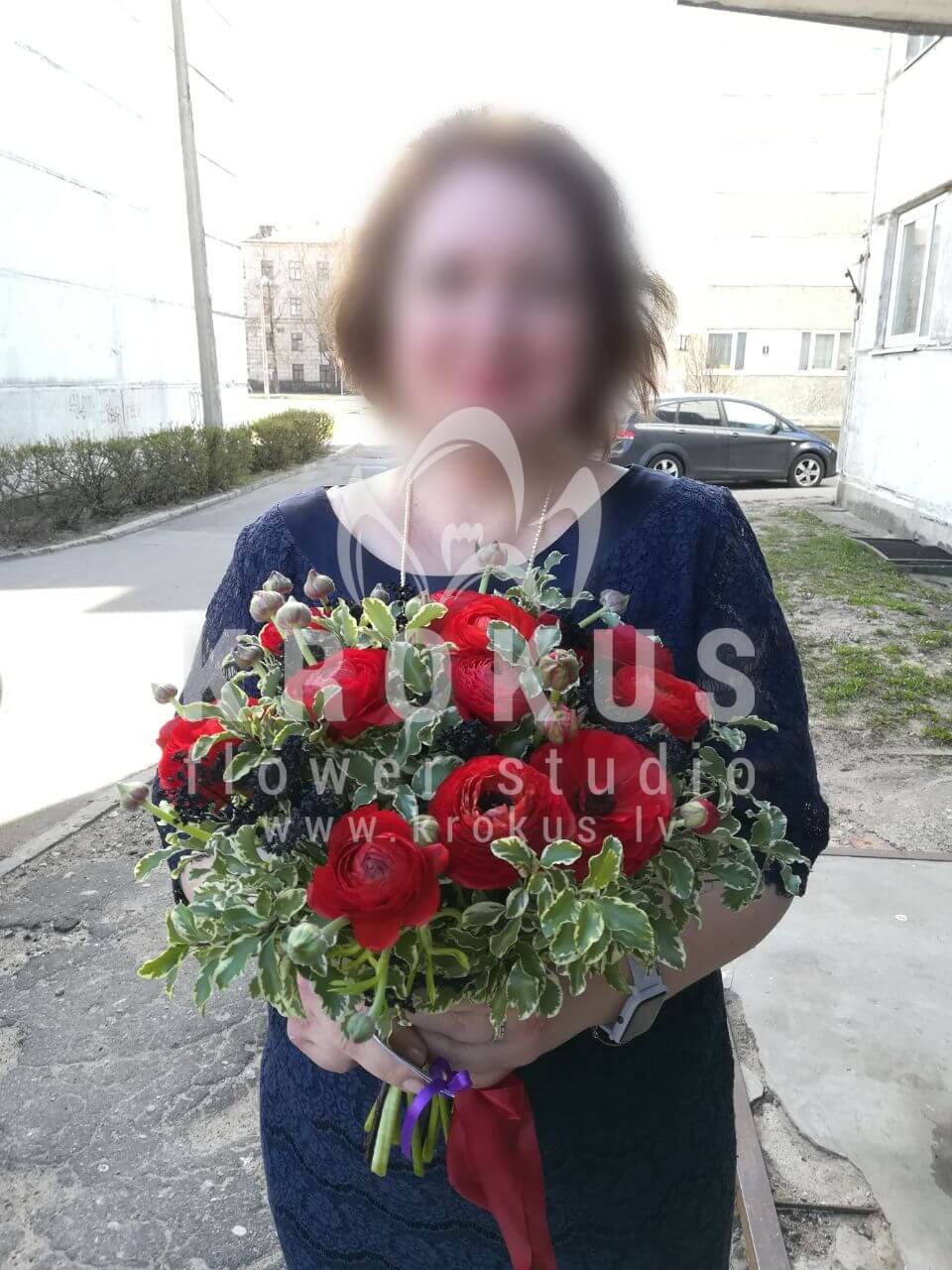 Ziedu sastāvā: Ranunkuļi, Pitosporas, Skimmija, Sarkanas rozes, Peonveidīgās rozes.