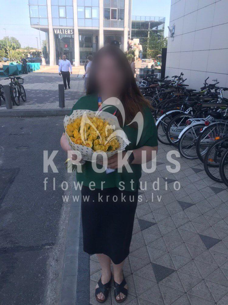 Mēs piegādājām vēl vienu pasūtījumu uz pilsētu Rīga. Pasūtītājs vēlējās: Ziedu piegāde Dzeltenas rozes 50см
