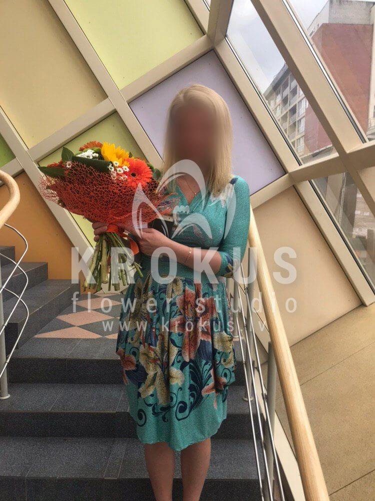 Ziedu sastāvā: Saulespuķes, Gerberas, Krizantēmas, Kumelīte, Aspidistra, Salal (Goltjēra), Alstremērija.