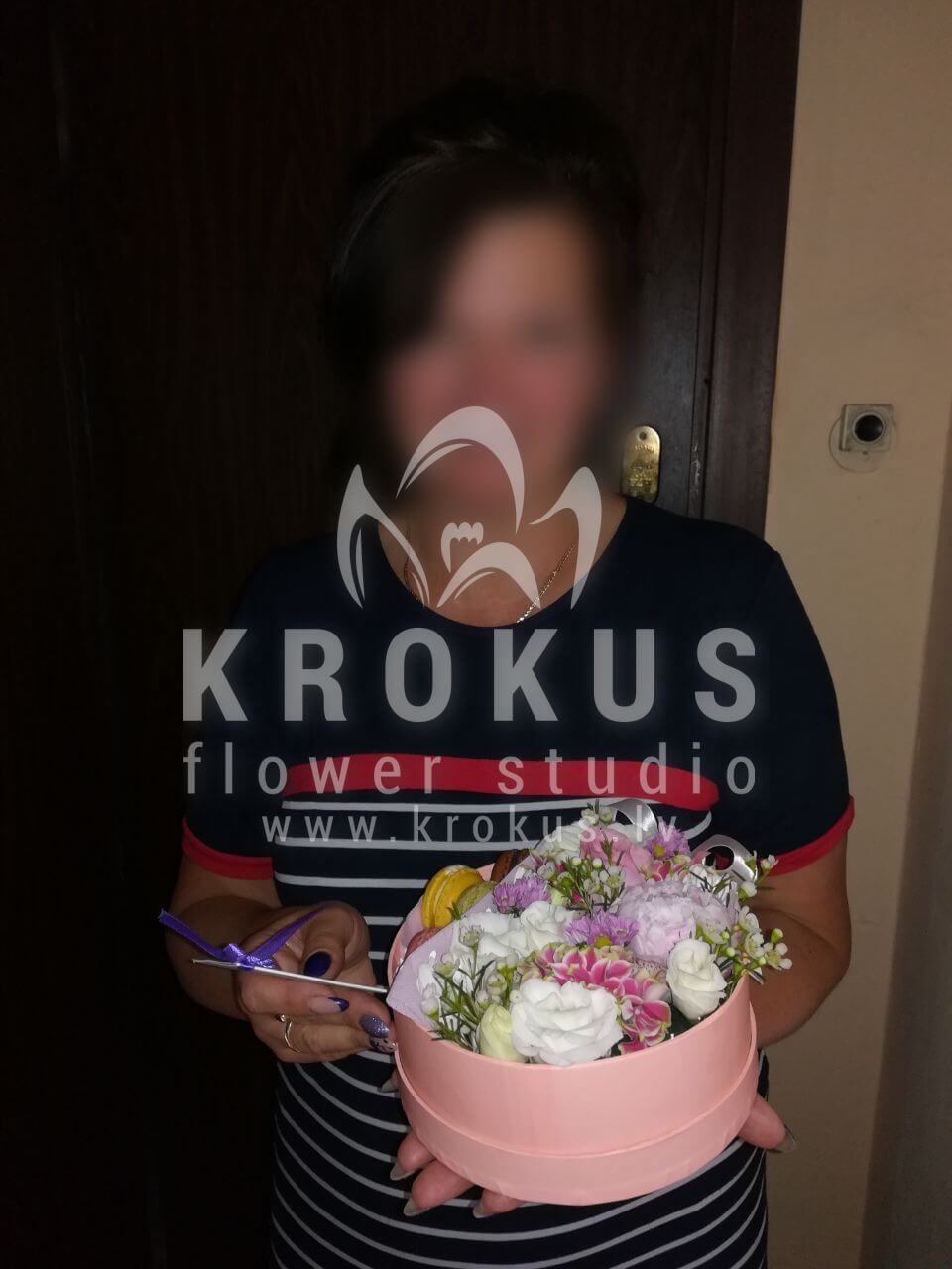 Mēs piegādājām vēl vienu pasūtījumu uz pilsētu Rīga. Pasūtītājs vēlējās: Ziedu piegāde Flowerbox ar macarooniem (Izmērs:
