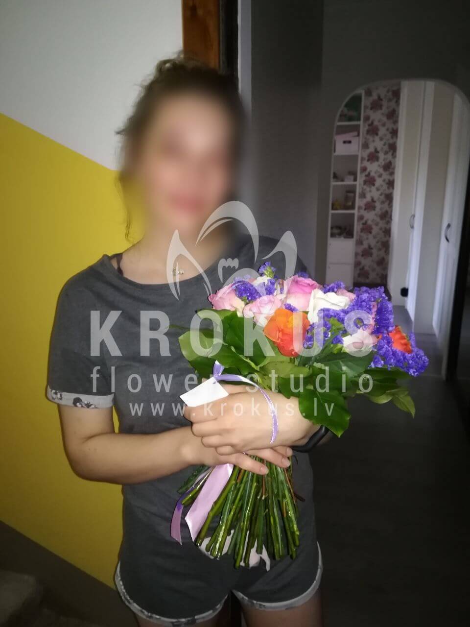 Ziedu sastāvā: Baltas rozes, Oranžas rozes, Krēmkrāsas rozes, Rozā rozes, Statice.