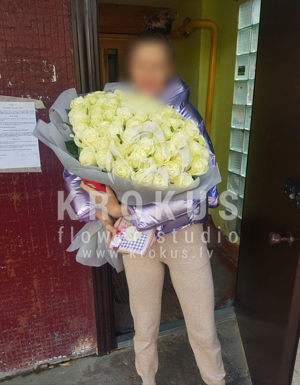 Mēs piegādājām vēl vienu pasūtījumu uz pilsētu Rīga. Pasūtītājs vēlējās: Ziedu piegāde Baltu rožu pušķis 70cm. Ziedu piegāde Kastīte ar saldumiem
