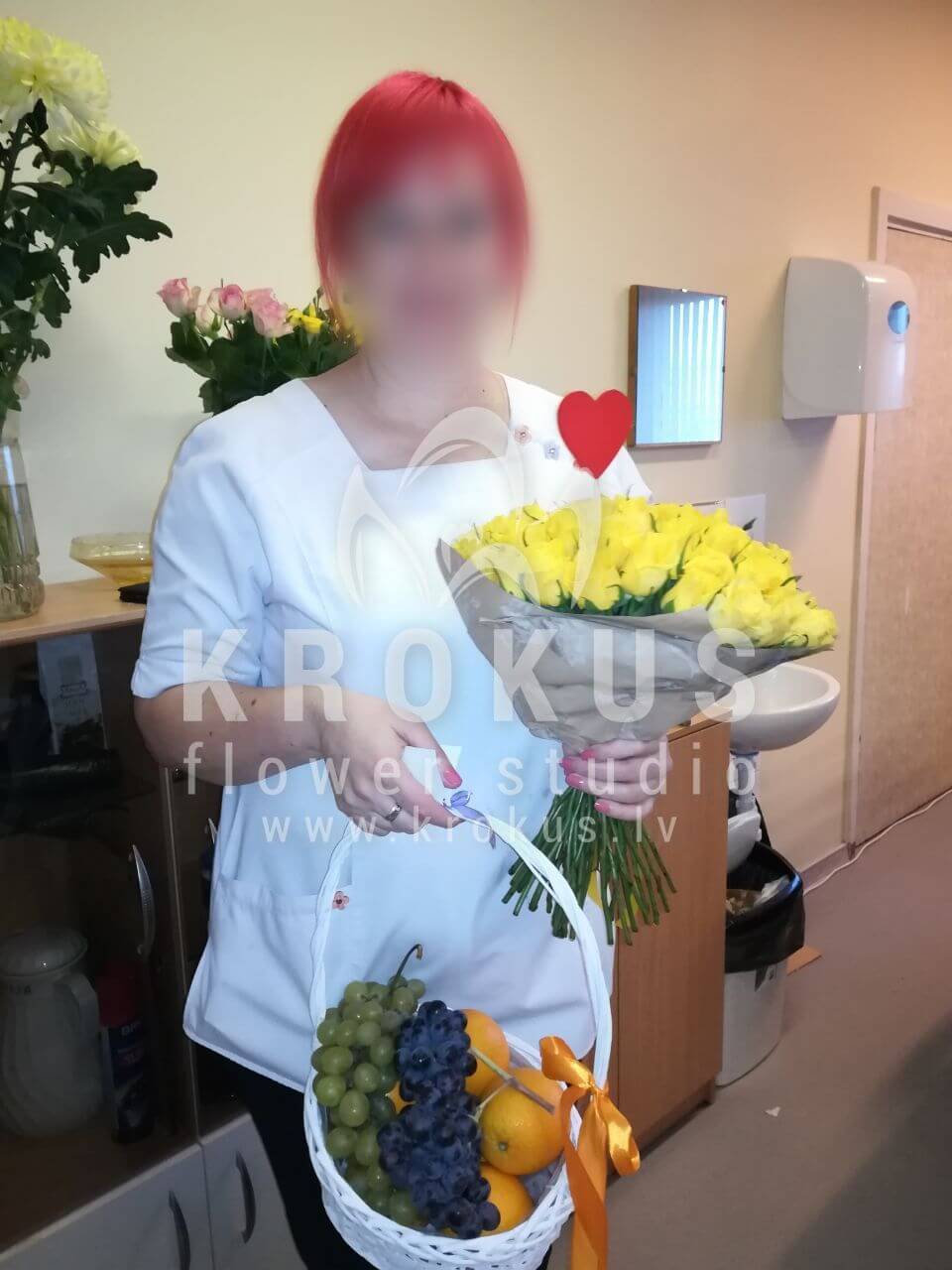 Mēs piegādājām vēl vienu pasūtījumu uz pilsētu Rīga. Pasūtītājs vēlējās: Ziedu piegāde Dzeltenas rozes 50см. Ziedu piegāde Augļu grozs Nr.1 (Sastāvdaļas: Apelsīns (10 gab.), vīnogas (1gab), grozs (krāsa un forma var atšķirties no attēlā redzamās formas)