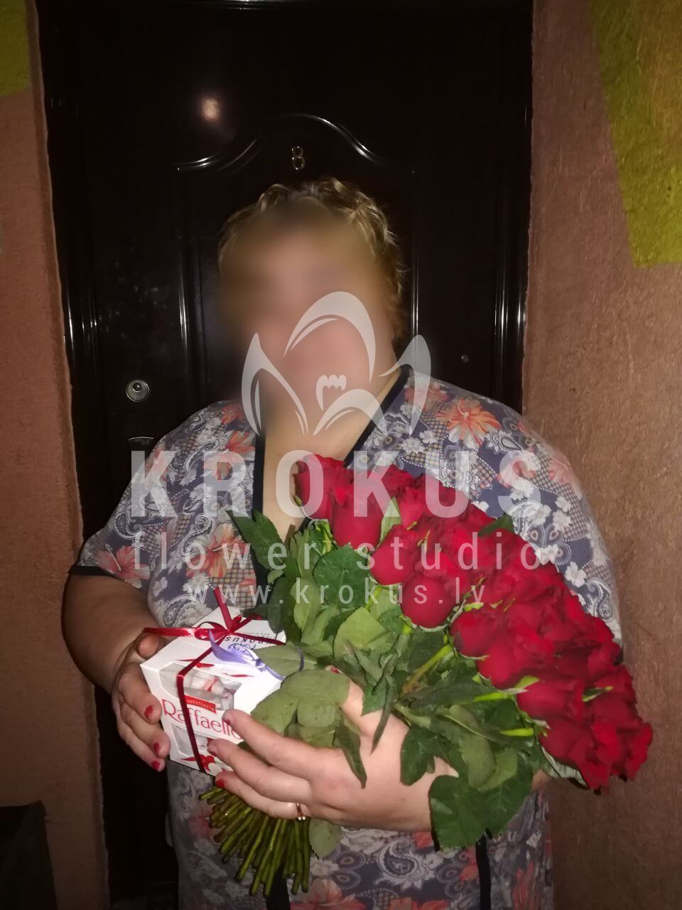 Mēs piegādājām vēl vienu pasūtījumu uz pilsētu Rīga. Pasūtītājs vēlējās: Ziedu piegāde 51 Sarkana roze SUPER CENA!!!. Ziedu piegāde Raffaello 150g (Konfektes RAFFAELLO, 150g